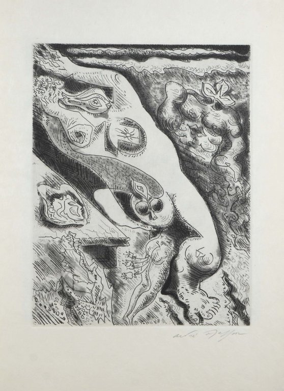 Erste Ausgabe. - Monod 6440. - Eins von nur 75 Exemplaren (Nr. 34) der Vorzugsausgabe auf "Vélin d'Arches", die eine signierte Extrasuite der Radierungen enthält, insgesamt 210 Exemplare. - Im Impressum vom Autor und Künstler signiert. - Schönes Beispiel für die fruchtbare Zusammenarbeit zwischen Autor und Künstler, wobei beide zum Kreis der Surrealisten zählen. - Sehr gutes Exemplar.