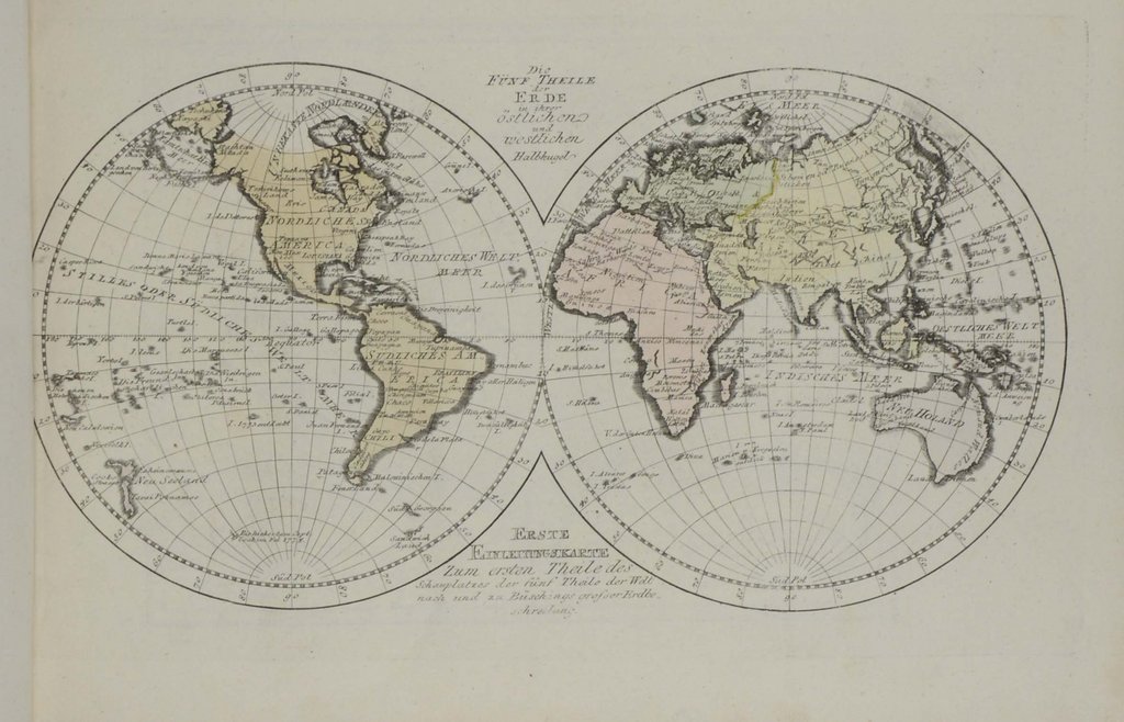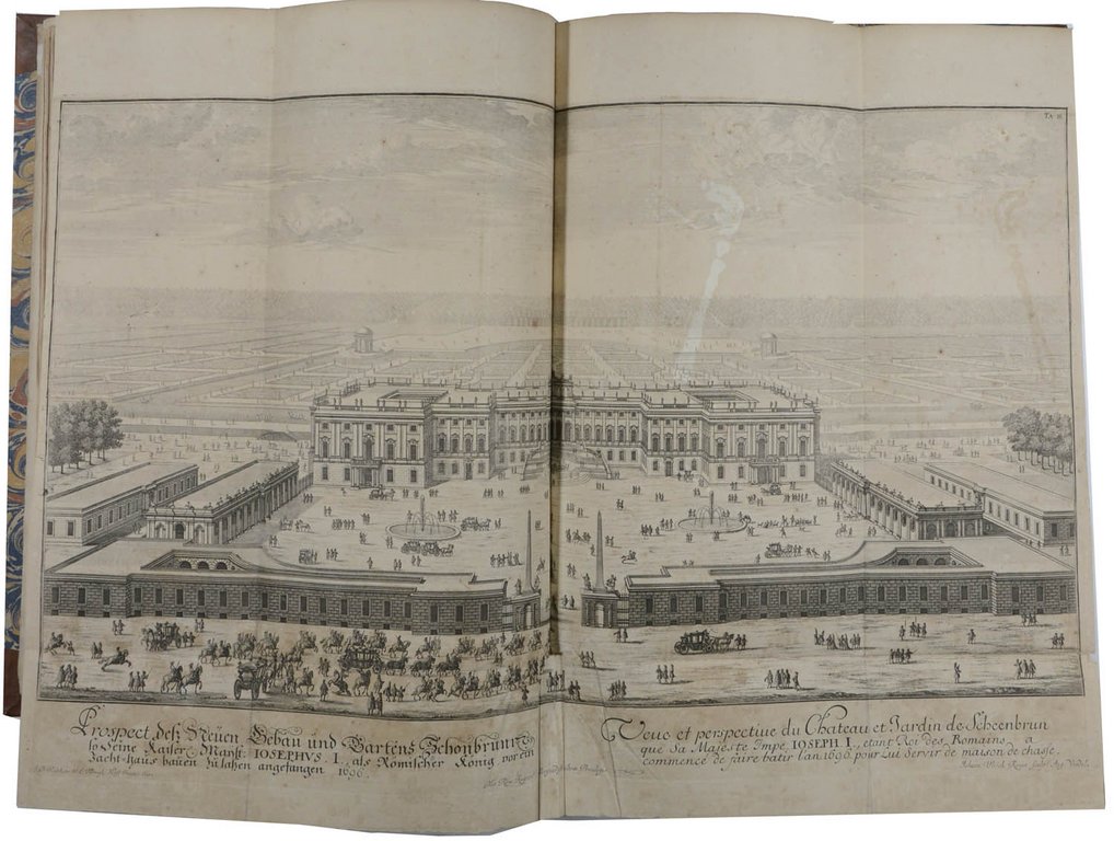 Zweite englische Ausgabe. - Fowler 121 Anm.; vgl. Ornamentstichsammlung 2105; - Der österreichische Bildhauer und Architekt Fischer von Erlach (1656-1723) veröffentlichte 1721 sein Hauptwerk "Entwurff, einer historischen Architektur", die als erste vergleichende Architekturgeschichte der Welt gilt. Beginnend mit den sieben Weltwundern (den Hängenden Gärten in Babylon, den ägyptischen Pyramiden, dem Wunderbild des Olympischen Zeus von Phidias, dem Mausoleum zu Halikarnassos, dem Tempel der Artemis zu Ephesos, dem Koloss von Rhodos und dem Leuchtturm auf der Insel Pharos) zeigt das Werk zahlreiche Architekturwerke vergangener Zeiten und der Antike, sowie Bauten aus verschiedenen Ländern bis zur chinesischen Mauer. "Er integriert die wegen ihrer Auffälligkeit 'populäre' Weltwunderarchitektur und schließt damit jene Lücke der Geschichte, die durch die einseitige Betonung der römischen Antike geschaffen worden war. " (Ausstellungskatalog Wolfenbüttel: Architekt und Ingenieur, S. 129/130). - Der vierte Teil stellt in 21 Tafeln seine eigenen Bauten in Wien dar. Teil 5 umfasst dann Abbildungen antiker und neuer Vasen. - Die meist prachtvollen und teils von der Phantasie beflügelten Kupfertafeln wurden von J.A.Delsenbach, B.Kenckel, J.U.Kraus, C.Engelbrecht, J.A.Pfeffel und C.de la Haye nach Vorlagen von Fischer gestochen. - Die englische Ausgabe ist ohne die Zwischentitel erschienen. - Ohne die Tafel 14 (Stonehenge & Felsenbühne in Salzburg) im zweiten Teil. - Etwas stock- und braunfleckig, stellenweise am oberen Rand etwas wasserfleckig, Tafeln teils mit Knickfalten, Tafel X im ersten Teil mit Einriss und Papierbruch im Falz, Tafel VIII im zweiten Teil mit Ausschnitt in der linken Bildecke, Tafel 3 im vierten Teil (Schönbrunn) mit Falzeinriss. Einige Anmerkungen in Tinte von alter Hand, davon auch Tafel 4 im ersten Teil betroffen.