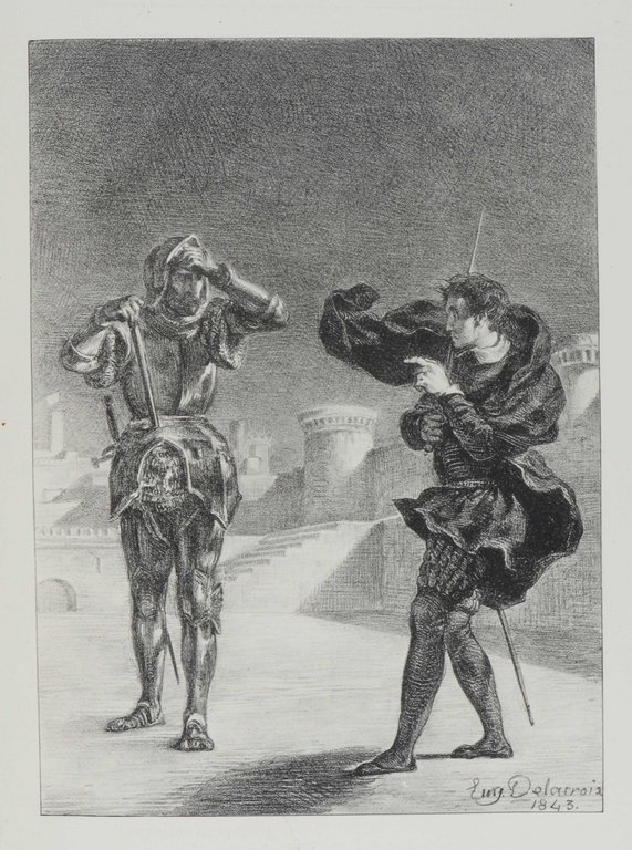 DELACROIX - SHAKESPEARE, (William). Hamlet, Prinz von Daenemark. Leipzig, Inselverlag, 1913. Folio. 175 S., 1 nn. Bl., mit 16 Lichtdrucktafeln nach Lithographien von Eugene Delacroix. Originalleder mit reicher Rückenvergoldung, Rücken- und Deckeltitel, Goldschnitt, (Rückendeckel etwas lichtrandig, Kanten leicht berieben) € 500,00