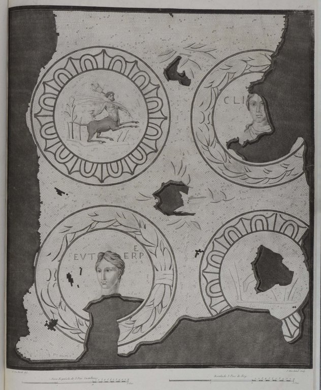 Erste spanische Ausgabe, selten. - Graesse IV, 59; Brunet III, 714. - Übersetzung des 1802 unter dem Titel "Description d'un pavé en mosaïque découvert dans l'ancienne ville d'Italica" erschienenen Titel. - Die in Aquatintatechnik gedruckten Tafeln zeigen meist Details des im Titel erwähnten Mosaiks im heutigen Sanponce bei Sevilla, sowie einige andere Mosaike (darunter ein Kentaur und ein Fragment aus Tarragona). Die hübschen Vignetten zeigen Medaillen, Inschriften, kaiserliche Porträts, eine Landkarte, Skulpturen der Musen und weitere Mosaiken. - Der Text beschäftigt sich mit der Geschichte des Mosaiks und des Wagenrennens in der Antike. Er enthält u.a Hinweise auf römische Altertümer, die verschiedenen europäischen Ländern entdeckt wurden. - Ohne die nicht nummerierte Tafel 21. - Der gestochene Titel ausgeschnitten und aufgezogen. - Einige Tafeln mit handschriftlicher Nummerierung, 2 Tafeln rückseitig etwas angeschmutzt, kleiner Wasserfleck am oberen Rand der ersten Seiten. - Die meisten Exemplaren wurden in Farbe gedruckt und beikoloriert, unser Exemplar ist komplett in Schwarz gedruckt und nicht koloriert.