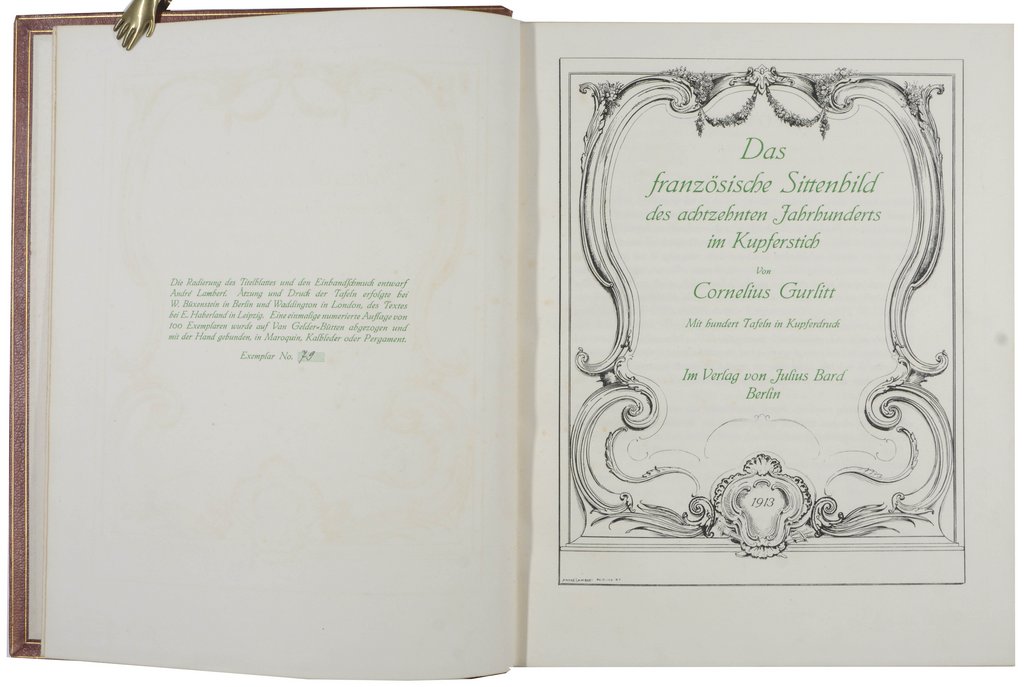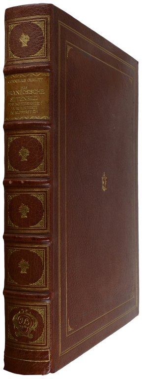 GURLITT, Cornelius. Das französische Sittenbild des achtzehnten Jahrhunderts im Kupferstich. Berlin, Julius Bard, 1913. Folio. 1 nn. Bl., gestochener Titel, III, 59 S., mit 100 Tafeln im Kupferdruck. Rotes Maroquin der Zeit mit dreifachen Deckelfileten, Eckfleurons und kleinem Mittelelement, reicher Rückenvergoldung und Rückenschild, Innenkantenfileten, Kopfgoldschnitt, (Ecken und Kanten leicht bestoßen, kleine Fehlstelle im Bezug auf Vorderdeckel). € 400,00