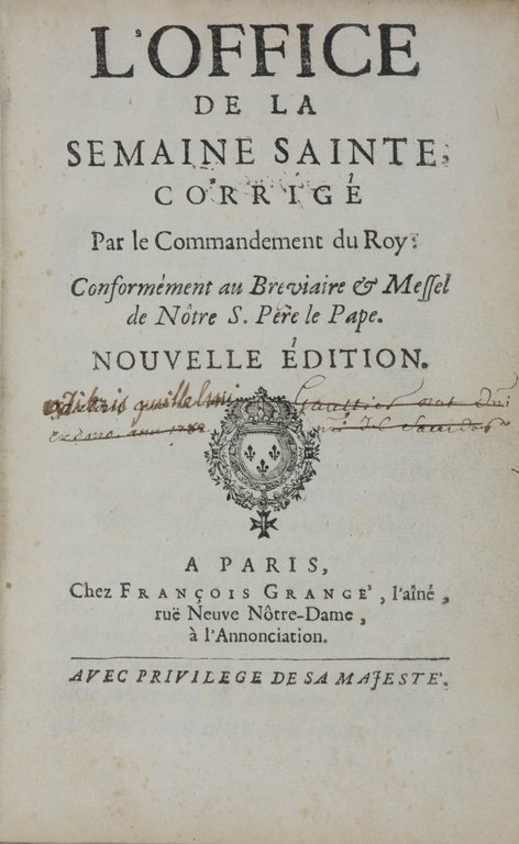WAPPENEINBAND - LOUIS XIV - L'Office de la Semaine Sainte; corrigé par le Commandement du Roy. Nouvelle édition. Paris, Fr. Grange, o.J. (um 1710) Gross-8°. 3 nn. Bl., 515 S., mit 4 ganzseitigen Kupfertafeln. Dunkelrotes Maroquin der Zeit mit reicher Rückenvergoldung, Vorder- und Rückendeckel jeweils mit dem Wappensupralibros Ludwigs XIV., dreifache Deckelfileten und Eckfleurons, Stehkantenvergoldung, Goldschnitt, (etwas beschabt und bestoßen, leicht aufgebogen, vorderes Gelenk leicht eingerissen). € 980,00