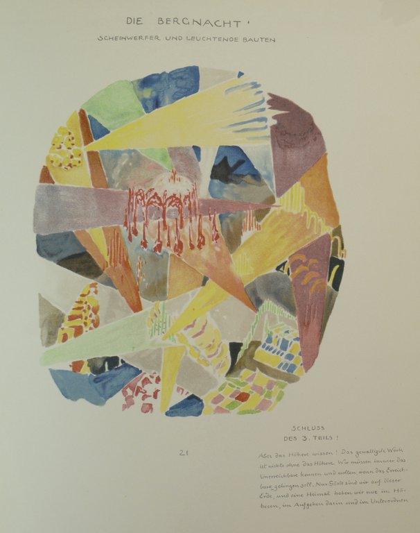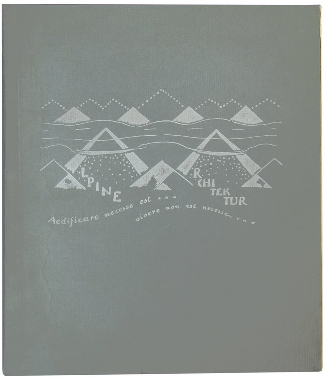 Erste Ausgabe. - Wichtigstes Werk zur romantisch-utopischen Architektur des von der Literatur Paul Scheerbarts beeinflussten Bruno Taut. Er entwirft in 5 Teilen die Vision einer neuen künstlichen Hochgebirgslandschaft. In den ersten 3 Teilen (Kristallhaus, Architektur der Berge und der Alpenbau) beschreibt er die bebauten Alpen mit riesigen Kristallhäusern, Pfeilern und Bögen, sowie Szenerien der veränderten Bergwelt. In den darauf folgenden 2 Teilen (Erdrindenbau und Sternbau) entwirft er eine utopische Architektur der Erde und des Kosmos mit transformierten Himmelskörpern wir dem "Domstern", "Gottesstern", usw. Das letzte Blatt dann "Das grosse Nichts". - Die ersten und letzten 5 Blatt im Bug und unteren Rand etwas wasserfleckig, Trägerkarton gering gebräunt, sonst gutes Exemplar.