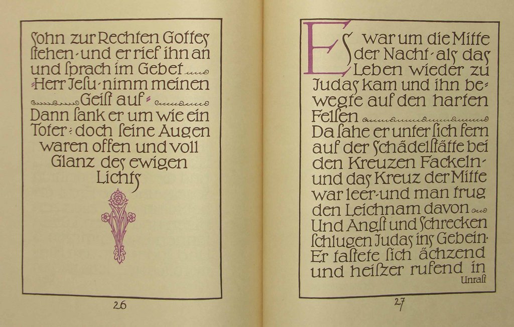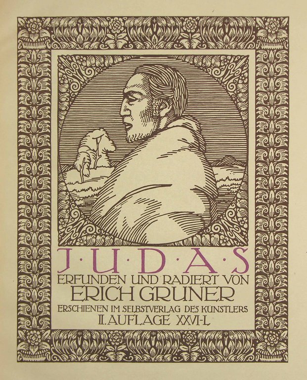 Zweite Auflage. - Eins von 25 nummerierten Exemplaren (XXVI-L) der 2. Auflage, insgesamt zusammen mit der ersten Auflage, nur 50 Exemplare. - Sehr selten. - Thieme/B. 15, 146. - Text und ornamentale Ausstattung ebenfalls von Gruner in Sepia gedruckt, Überschriften und Initialen in Lila. Schriftstellerische Bearbeitung von Karl Friedrich Selle. Druck von W.Drugulin, Einband von Carl Sonntag jun. - "Sein erstes größeres graph. Werk "Judas" erscheint 1912, der Text vom Künstler selbst geschrieben (danach klischiert).... G.'s fast verwirrende Vielseitigkeit läßt ihn die verschiedensten Techniken mit großer Gewandtheit handhaben..." (Thieme/B.) - Der Maler und Grafiker Gruner (1881-1966) wurde insbesondere durch das "Leipziger Doppel-M" (dem Messelogo) bekannt. - Papierbedingt an den Rändern leicht gebräunt.