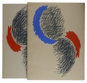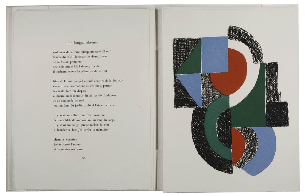 Erste Ausgabe. - Monod 10802. - Im Druckvermerk von Sonia Delaunay und Tristan Tzara signiert. - Eins von 90 nummerierten Exemplaren (insgesamt 140) auf Grand Velin (Nr. 129). - Dritter Band der Reihe "La Rose des Vents". - Der dadaistische Schriftsteller Tristan Tzara und die abstrakte Malerin und Designerin Sonia Delaunay arbeiteten bereits in den 20er Jahren zusammen. Da beide ein großes Interesse an illustrierten Büchern hatten, entstand 1961 diese Sammlung von elf zwischen 1947 und 1950 geschriebenen Gedichten, mit acht ganzseitigen Farbradierungen sowie einer zusätzlichen für den Schuber, die auf der Vorderseite richtig herum und auf der Rückseite verkehrt herum gedruckt wurde. - Teils leicht stockfleckig.
