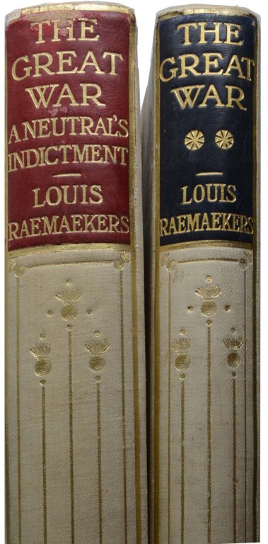 RAEMAEKERS, Louis. The Great War. A neutral's indictment. With an appreciation by H.Perry Robinson and descriptive notes by E.Garnett (and) M.B.Huish. London, The Fine Art Society, 1916-1917. Folio. XXX; XVII S., 1 nn. Bl., mit montiertem Porträt und 160 Tafeln mit montierten, meist farbigen Abbildungen. Originalhalbleinen mit Rückenschildern und Rückenvergoldung, Kopfgoldschnitt, (etwas beschabt, Ecken leicht gestaucht). € 950,00