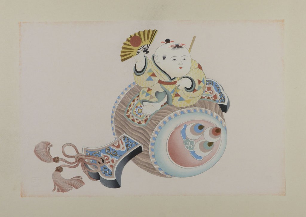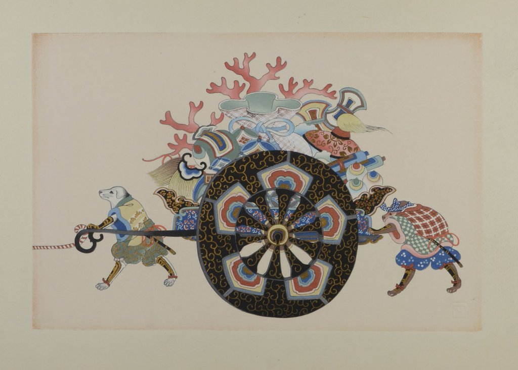 Die im traditionellen Stil geschaffenen Illustrationen zu bekannten japanischen Märchen durch den Künstler Kojima Gyokuho (1907-1934) sind detailliert und fein ausgearbeitet und mit zarten Pastelltönen unterlegt. - Gering gebräunt, 1 Blatt (Impressum) mit restauriertem Durchriss.