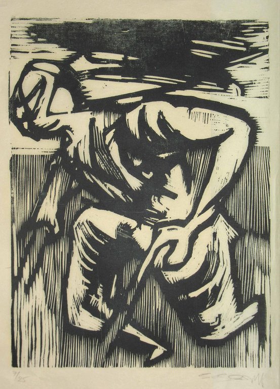 Wohl ein späterer Abzug von 1909. - Berühmtes Blatt des aus Emmendingen stammenden "Ur-Frankfurters". Fritz Boehle (1873-1916) studierte an der Städelschule bei Hasselhorst und Kirchbach. Unter dem Einfluss der Neuromantiker entstanden im traditionellen Stil Gemälde und Radierungen über das Leben der Mainschiffer, Bauern und Handwerker, die ihm frühen Ruhm einbrachten.