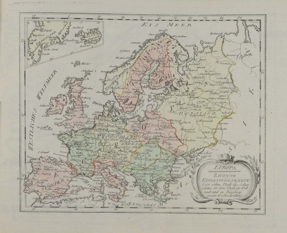 Matthäus Seutter (1678-1757), Schüler von Homann, eröffnete 1707 eine eigene kartographische Anstalt in Augsburg, wo er ab 1728 mit der Anfertigung verschiedener großer Atlanten begann. - Kräftiger Druck des Kupferstichs mit leuchtendem Altkolorit.