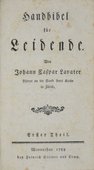 Erste Ausgabe. - Goedeke IV/1, 273, 57. Wilpert-Gühring 141; Weigelt 201.1. - Später mehrfach unter dem Titel "Handbibliothek für Freunde" veröffentlichte Ratschläge und Inspirationen aus der Bibel durch den Schweizer Schriftsteller und Prediger Johann Kaspar Lavater (1741-1801). Dessen Predigten regen Zulauf hatten und der ab 1765 eine Reihe von christlichen Werken veröffentlichte. Am bekanntesten wurde er jedoch durch die Publikation seiner "Physiognomik". - Geschenkvermerk von 1811 auf fliegendem Vorsatz, leicht stockfleckig. - Dekoratives Exemplar.