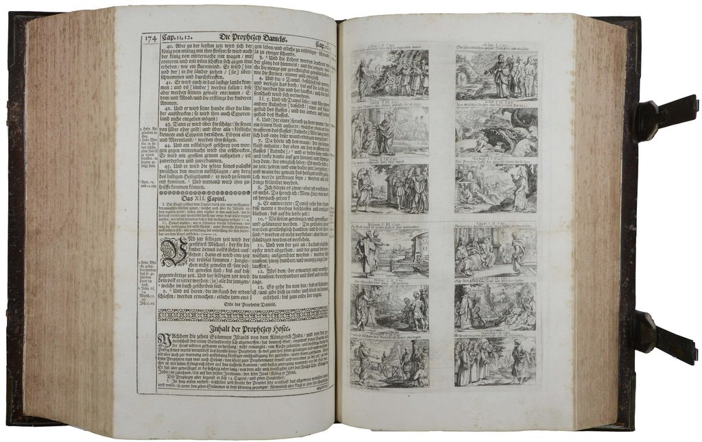 BIBEL - Biblia, Das ist: Die ganze heilige Schrift: Darinn begriffen alle Bücher des Alten und Neuen Testaments: Aus den Grund-Sprachen treulich und wol verteutschet: aufs Neue, und mit Fleiß widerum übersehen. Samt dienstlichen Vorreden:... und einem nuzlichen Register. 4 Teile in 1 Band. Zürich, Gessner, Bodmer, 1712 und 1711. Folio. Gestochener Titel, und 16 ganzseitigen Kupfertafeln. Brauner Lederband der Zeit mit Rückenvergoldung und vergoldeten Fileten auf den Deckeln, mit insgesamt 10 aufwändig verzierten Messingbeschlägen und 2 Schließen, (gering beschabt, Kapitale leicht bestoßen, Schließen ergänzt). € 1.200,00