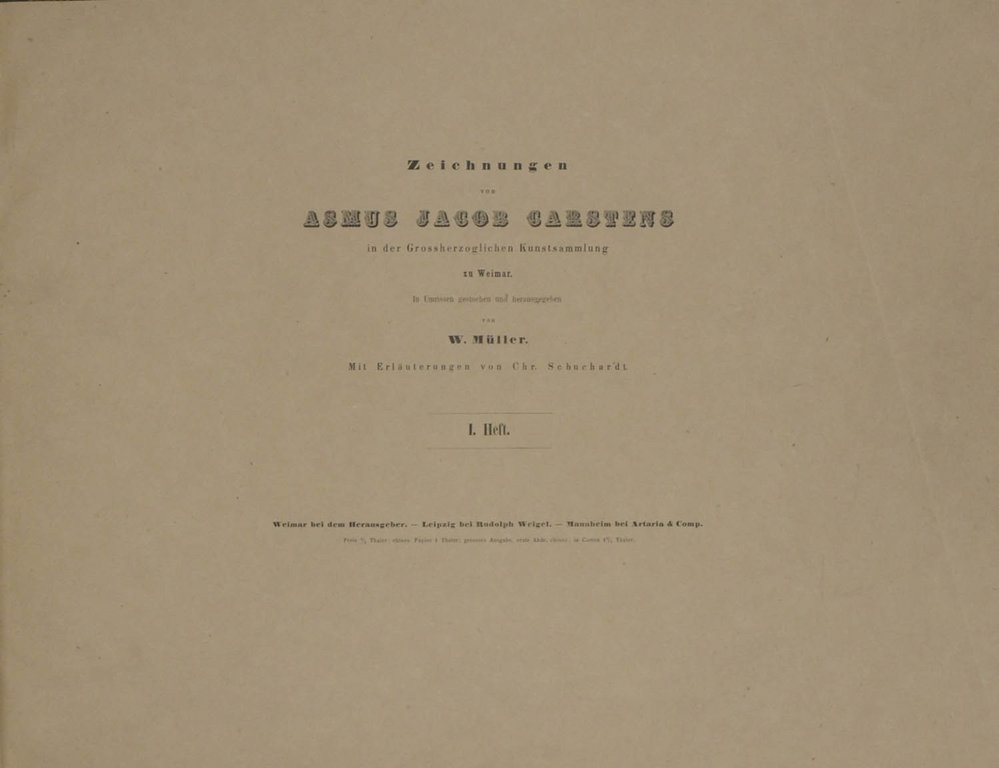 CARSTENS - MÜLLER, W. (Hrsg.). Zeichnungen von Asmus Jacob Carstens in der Grossherzoglichen Kunstsammlung zu Weimar. Mit Erläuterungen von Chr. Schuchardt. Hefte 1-7 (von 11) in 1 Band. Weimar, Müller, Leipzig, Weigel und Mannheim, Artaria, 1849. Quer-Folio. 1 nn. Bl. und 27 Umrissradierungen. Schlichtes Halbleinen der Zeit mit Rückentitel, Originalumschläge eingebunden, (leicht berieben, Kanten etwas bestoßen). € 120,00