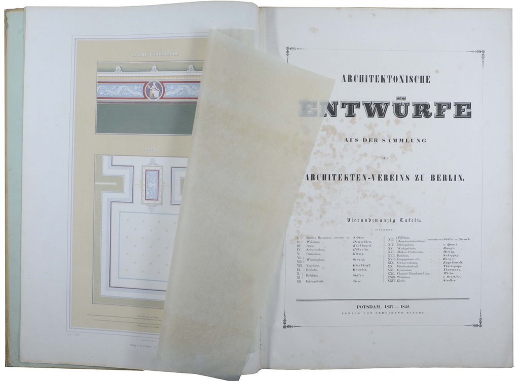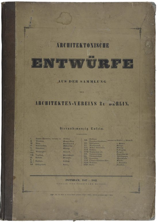 ARCHITEKTUR - Architektonische Entwürfe aus der Sammlung des Architekten-Vereins zu Berlin. Potsdam, Ferdinand Riegel, 1837-1842. Groß-Folio. 15 S., S. (3)-12 und S. (3)/4, mit 3 lithographischen (1 farblithographischen) und 21 gestochenen Tafeln. Originalhalbleinen mit Deckeltitel, (Kanten berieben und bestoßen , etwas fleckig). € 1.200,00