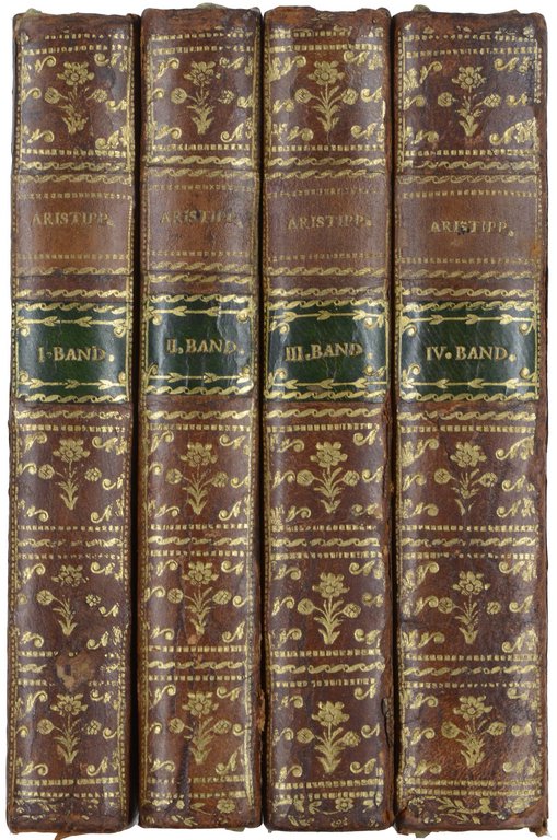 WIELAND, C(hristoph) M(artin) (Hrsg.). Aristipp und einige seiner Zeitgenossen. 4 Bände. Leipzig, Georg Joachim Göschen, 1800-1801. 8°. Marmoriertes Ganzleder der Zeit mit Rückenvergoldung und Rückenschildern, (etwas beschabt, Kapitale leicht gestaucht, leicht fleckig). € 380,00