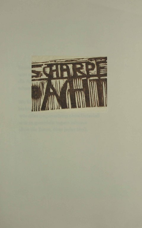 SCHARPF, Rudolf. Acht. Folge von vier Niederschriften und acht Holzschnitten. Ohne Ort und Drucker, um 1960. Groß-Folio. 4 Gedichte auf je einem Doppelbogen, 8 num. und sign. Original-Holzschnitte auf 4 Doppelbögen. 1 Doppelbogen als Umschlag mit kl. mont. Titelholzschnitt. Original-Pappmappe mit Prägung der Signatur des Künstlers, (Ecken gering bestoßen, leicht fleckig). € 300,00