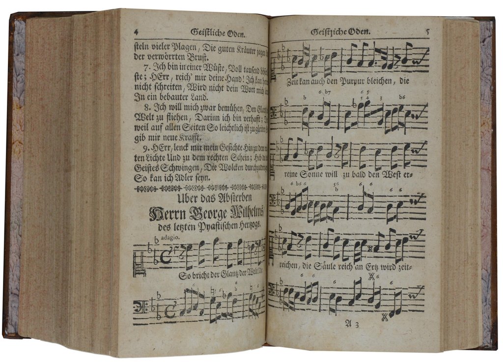 - Etwas späterer Druck der sogenannten Fellgiebelsche Ausgabe, die je nach Bedarf in unterschiedlicher Reihenfolge zusammengebunden wurde. - Von den 15 Kompositionen werden 8 Melodien in den "Geistlichen Oden" J.S.Bach zugeschrieben. - Papierbedingt etwas gebräunt.
