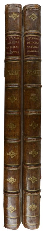 KNORR, Georg Wolfgang. Deliciae naturae selectae, of uitgeleezen kabinet van natuurlyke zeldzaamheden; welke de drie ryken der natuur aanbieden, om door keurige liefhebberen verzameld te worden.... Nu in het Nederduitsch overgezet en met aanmerkingen vermeerderd door Ph. I. S. Muller. 2 Bände. Dordrecht, A. Blussé en Zoon, 1771. Groß-Folio. Gestochener Titel, 2 nn. Bl., XXXII, 67 S.; 1 nn. Bl., XXXIV (recte XXX) S., S. (3)-70, mit 91 (1 gefalteten) altkolorierten Kupfertafeln. Etwas späteres Halbleder mit Rückenvergoldung und Rückenschild, (leicht berieben, Ecken etwas gestaucht). € 18.500,00