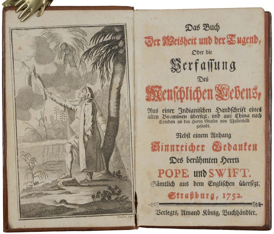 (DODSLEY, Robert). Das Buch Der Weisheit und der Tugend, Oder die Verfassung Des Menschlichen Lebens. Aus einer Indianischen Handschrift eines alten Braminen übersezt, und aus China nach London an den Herrn Grafen von Chesterfield gesandt. Nebst einem Anhang Sinnreicher Gedanken Des berühmten Herrn Pope und Swift. Sämtlich aus dem Englischen übersezt Straßburg, Amand König, 1752. 8°. Gestochenes Frontispiz, 15 nn. Bl., 256 S. Leder der Zeit mit goldgeprägtem Wappensupralibros (datiert 1772), Rücken- und Deckelvergoldung und Rückenschild, (gering beschabt). € 600,00