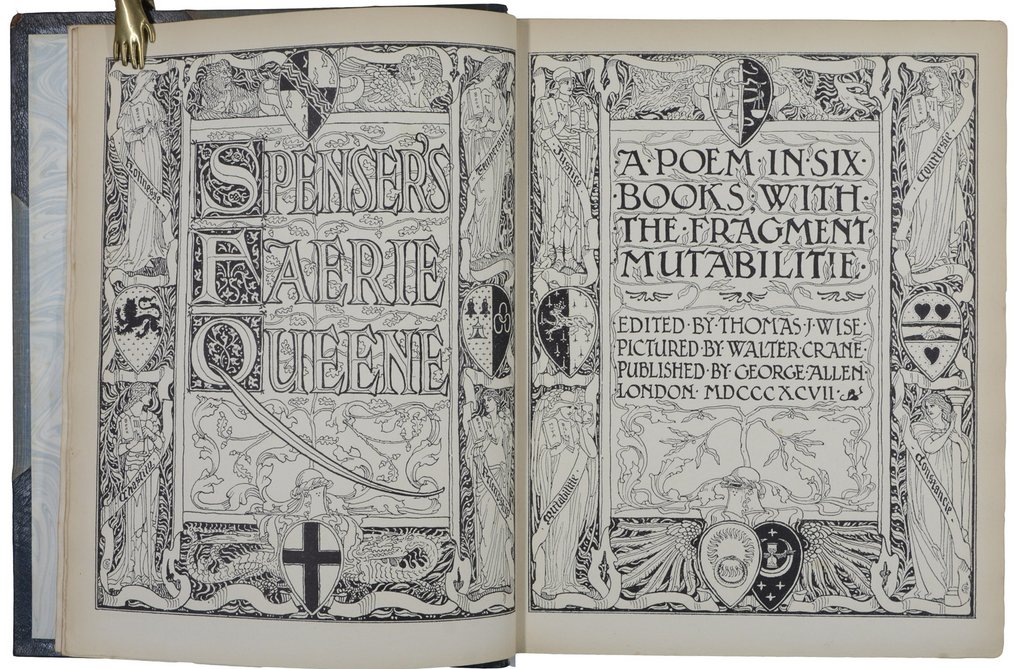 CRANE - SPENSER, Edmund. Fairie Queene. A poem in six books with the Fragment Mutabilitie. Edited by Thomas Wise. 6 Bände. London, George Allen, 1895-1897. 4°. Mit zahlreichen Holzschnitttafeln, Holzschnitttitelbordüren und Holzschnittvignetten von Walter Crane. Halbleder der Zeit mit reicher Rückenvergoldung, Kopfgoldschnitt, Originalvorderumschläge jeweils hinten eingebunden, (etwas beschabt, Gelenke angeplatzt). € 2.200,00
