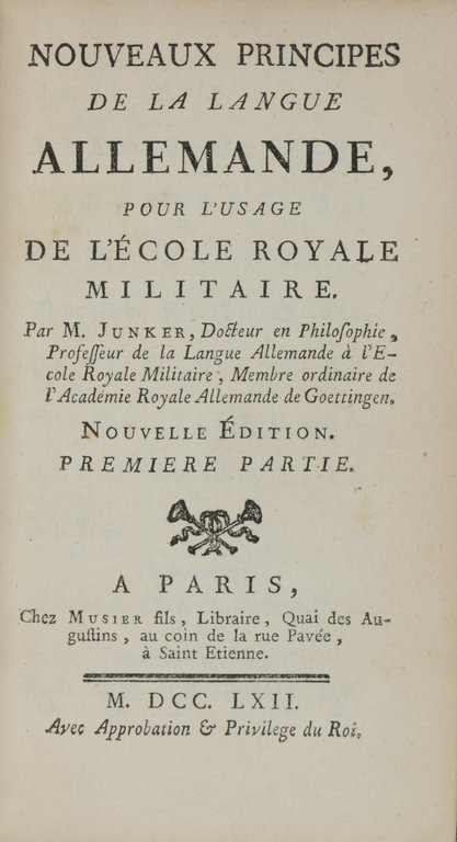 WAPPENEINBÄNDE - JUNKER, (Georg-Adam). Nouveaux principes de la langue Allemande, pour l'usage de l'École Militaire. Nouvelle édition. 2 Bände. Paris, Musier, 1762. 8°. 2 nn. Bl., LXIV, 278 S.; 1 nn. Bl., 408 S. Dunkelrotes Maroquin um 1765 mit reicher floraler Rückenvergoldung und Rückentitel, Vorder- und Rückendeckel jeweils mit dem Wappensupralibros Ludwigs XV., doppelte Deckelfileten, Steh- und Innenkantenvergoldung, Goldschnitt, (leicht beschabt und leicht fleckig). € 1.200,00