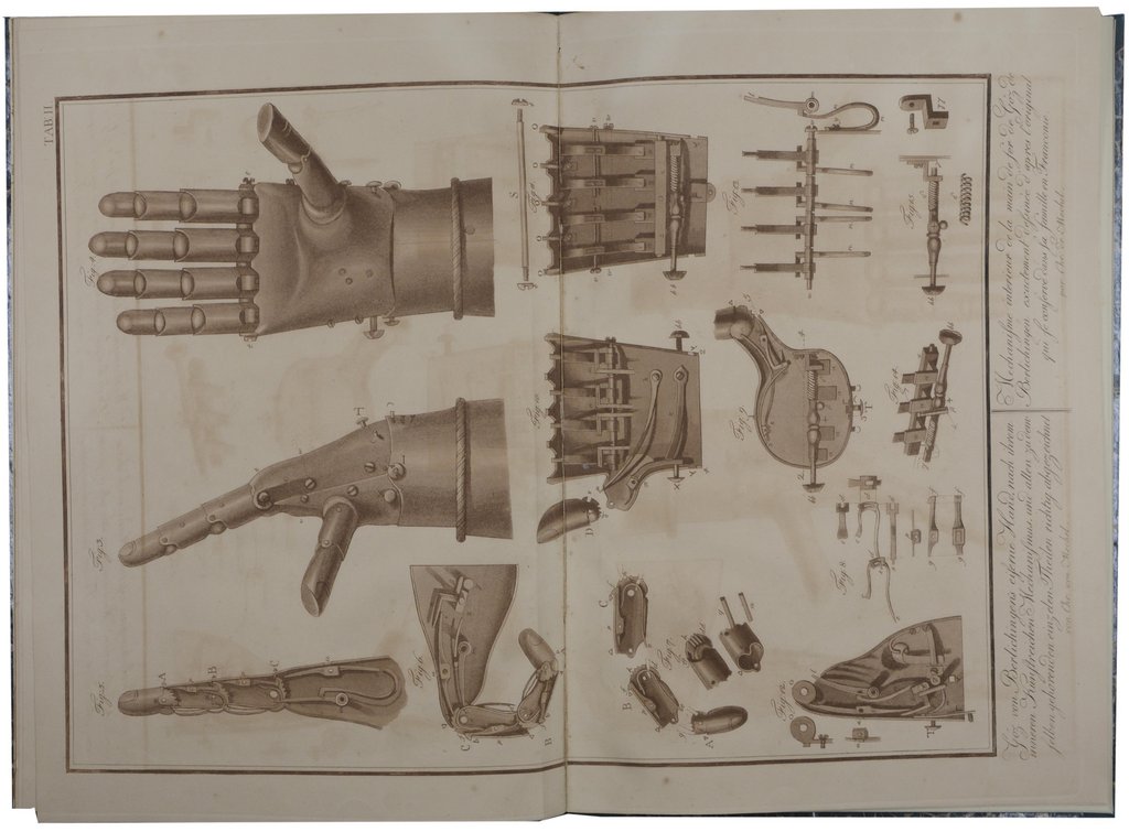 Erste Ausgabe. - Slg. Kippenberg 1636; Lipperheide Ra12. - Der Text beschreibt die Mechanik der berühmten Prothese, die zu ihrer Zeit keineswegs eine neue Erfindung darstellte, jedoch aufgrund der Geschichte ihres Trägers, die berühmteste ihrer Art ist. Es handelt sich hierbei um die zweite komplexere Mechanik. Eine erste, wesentlich grobere Hand war nach den eigenen Entwürfen des Ritters gefertigt worden. Des weiteren eine Lebensgeschichte des Ritters, sowie zwei Seiten mit Zitaten und Versen aus der deutschen Literatur, die sich auf die eiserne Hand beziehen. - Die beiden großen Aquatintatafeln in Sepia, gestochen von Christian Mechel, zeigen die Hand in ihrer natürlichen Größe, sowie detailliert die Technik derselben. - Mit einem gestochenen Porträt, nach dem Familienmonument von E.Henne und einer Ansicht von Burg Jagsthausen von und nach Carl G. Brühl. - Etwas stockfleckig und gebräunt, Im Bug teils angerändert bzw. verstärkt, Ex-Libris (Rudolf Korn) auf Innendeckel.