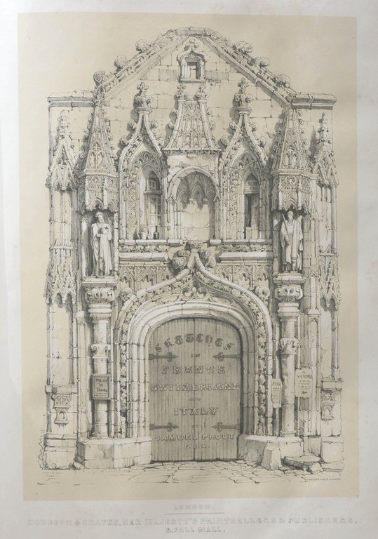Erste Ausgabe. - Der Druck erfolgte bei C. Hullmandel in London. - Der englische Zeichner Samuel Prout (1783-1852) wurde vor allem durch seine Motive historischer Städte Europas bekannt. Ab 1818 reiste er durch verschiedene Länder und hielt zahlreiche architektonische Details in seinen Zeichnungen fest. - Die Tafeln mit Ansichten von Tours, Chartres, Strassburg, Genf, Lausanne, Mailand, Verona, Venedig, Rom, Basel, etc. - Gering stockfleckig, Titel leicht stärker betroffen.