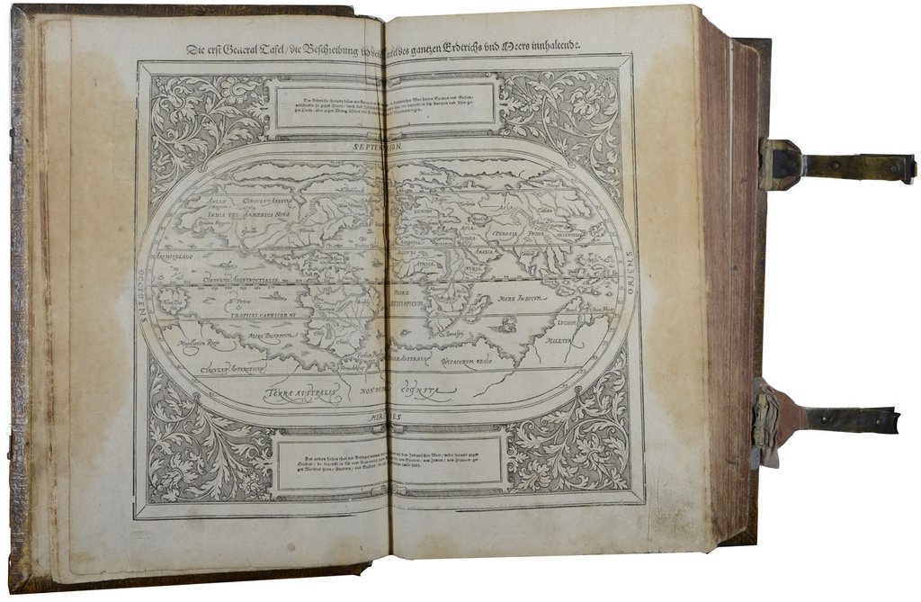 MÜNSTER, Sebastian. Cosmographia, Das ist: Beschreibung der gantzen Welt, darinnen aller Monarchien, Keyserthumben, Königreichen...Länderen, Stätten und Gemeinden... Beschaffenheit. Auff das newe ubersehen und mit vielerley nothwendigen Sachen.... einer vollkommnen Beschreibung der unbekandten Länder Asiae, Africae, Americae.... biß auff dieses 1628. jahr kundt gemacht worden. Basel, Henripetri, 1628. Folio. Gestochener Titel, 12 nn. Bl., 1752 (recte 1748) S., (ohne die Seiten 53/54; 495-498 und 1365-1368), mit 23 (von 26) doppelblattgroßen Vortextkarten, 71 (von 73) doppelblattgroßen Ansichten und Plänen und mehr als 1400 Holzschnittillustrationen im Text. Blindgeprägtes Schweinsleder der Zeit über Holzdeckeln mit 2 Schließen, (berieben, Kapitale stärker betroffen, Rücken am unteren Rand geklebt; Gelenk etwas eingerissen, 1 Schließhaken unschön mit Pflaster befestigt). € 5.500,00