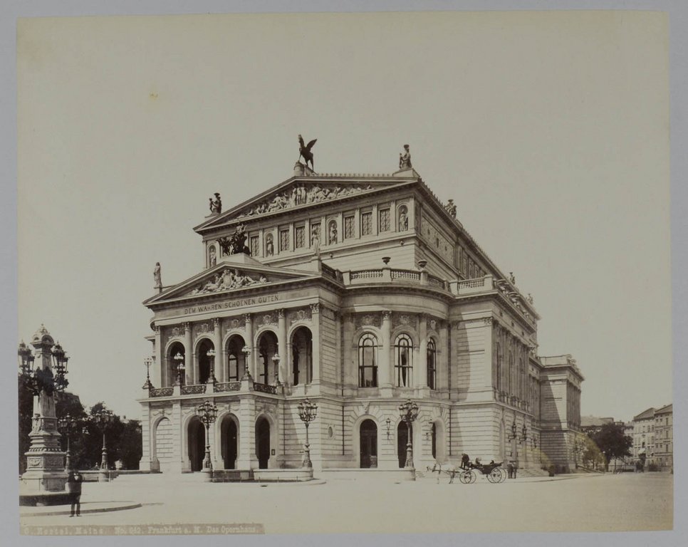 Schöne Ansicht sder Alten Oper. - Carl Hertel (1832-1906) eröffnete 1863 in Mainz ein Photostudio. Beginnend mit Porträtaufnahmen gab er ab 1878 eine Reihe von Photographien von Frankfurt und Mainz heraus. - Nummer 642. - Gering fleckig.