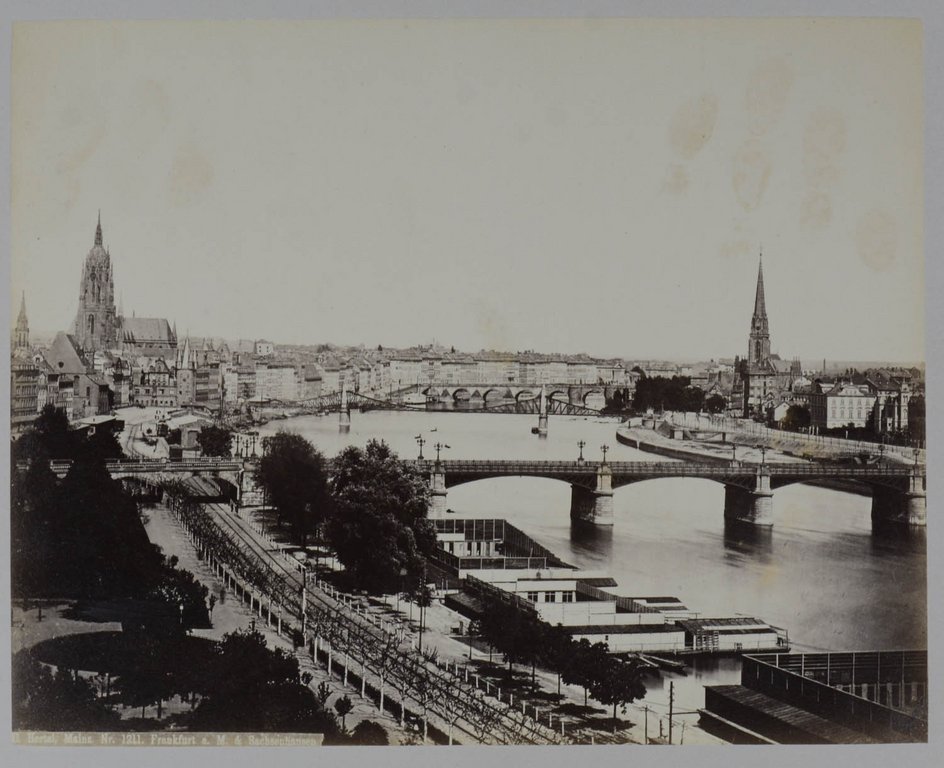 Schöne Ansicht mit den Badeanstalten am Main im Vordergrund. - Carl Hertel (1832-1906) eröffnete 1863 in Mainz ein Photostudio. Beginnend mit Porträtaufnahmen gab er ab 1878 eine Reihe von Photographien von Frankfurt und Mainz heraus. - Nummer 1211. - Gering fleckig.