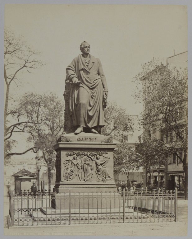 Ansicht des Goethedenkmals mit einigen angrenzenden Häuserns des Goetheplatzes. - Carl Hertel (1832-1906) eröffnete 1863 in Mainz ein Photostudio. Beginnend mit Porträtaufnahmen gab er ab 1878 eine Reihe von Photographien von Frankfurt und Mainz heraus. - Nummer 546a