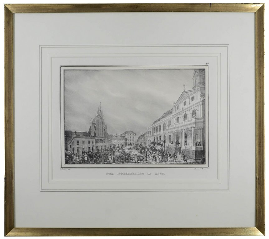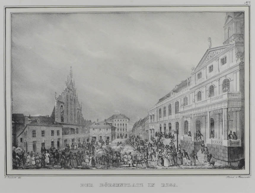 RIGA/Lettland. Der Börsenplatz. Teilansicht des Börsenplatzes mit dem Rathaus am rechten Bildrand. Lithographie von Hauswald nach Jantzen. Um 1850.. 22,5 x 30. Gerahmt. € 450,00